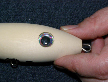 glue belly grommet into recessed hole in bottom of lure. Glue eyes in
